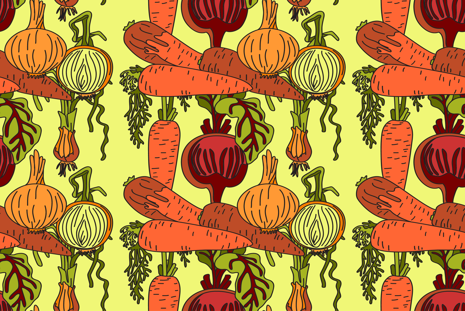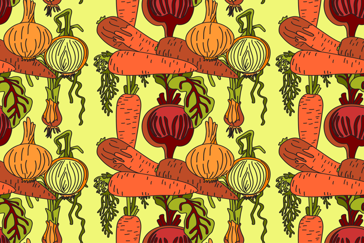 Botanical abstract seamless pattern with cartoon colorful carrots, onions, beets vector illustration. Repeating vegetables pattern in yellow color background. Graphic design for Fashion Cover Textile Birthday Greeting Card Invitation Wedding Poster Product Print Wallpaper Book Shop Advertising