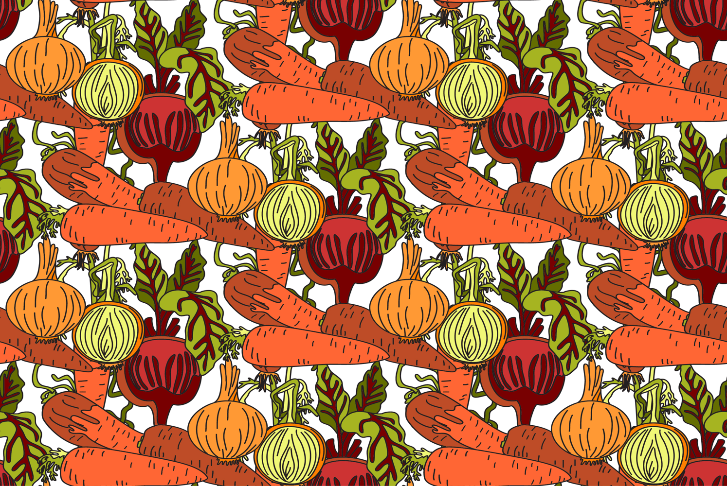 Botanical abstract seamless pattern with cartoon colorful carrots, onions, beets vector illustration. Repeating vegetables pattern in white color background. Graphic design for Fashion Cover Textile Birthday Greeting Card Invitation Wedding Poster Product Print Wallpaper Book Shop Advertising