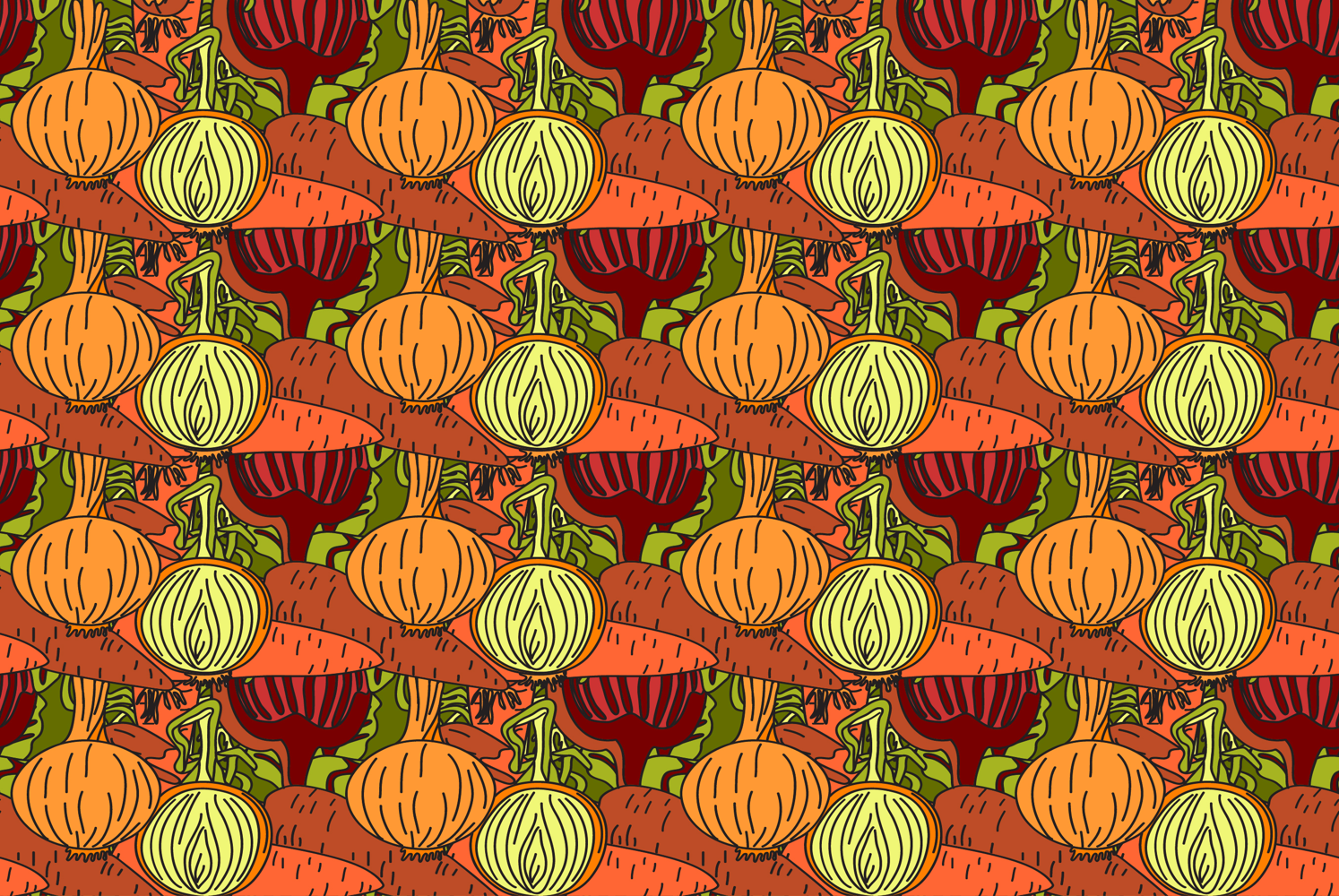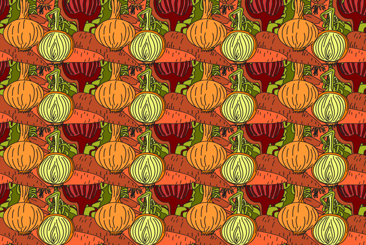 Botanical abstract seamless pattern with cartoon colorful carrots, onions, beets vector illustration. Repeating vegetables pattern in orange color background. Graphic design for Fashion Cover Textile Birthday Greeting Card Invitation Wedding Poster Product Print Wallpaper Book Shop Advertising