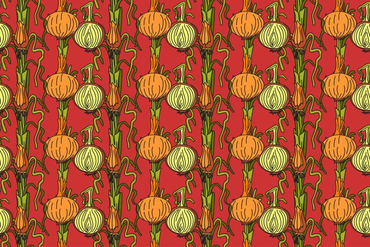 Botanical abstract seamless pattern with juicy onions vector illustration. Colorful vegetables repeating cartoon pattern in red color background. Graphic design for Fashion Cover Textile Birthday Greeting Card Invitation Wedding Poster Product Print Wallpaper Book Shop Market Advertising