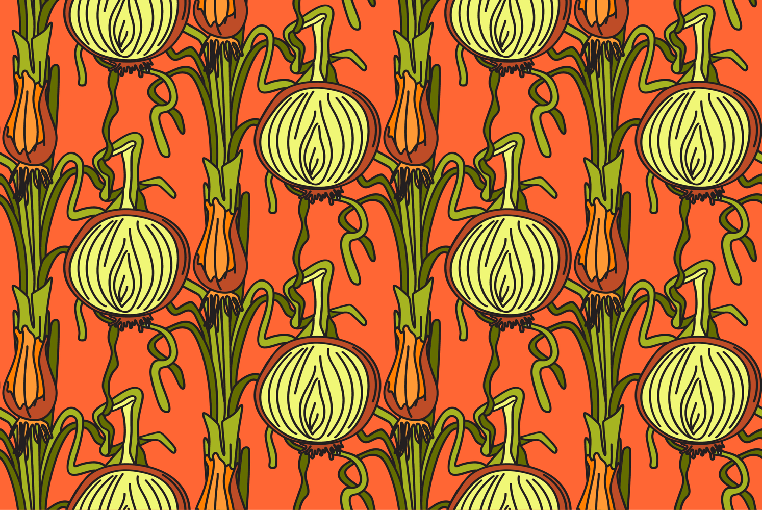 Botanical abstract seamless pattern with juicy onions vector illustration. Colorful vegetables repeating cartoon pattern in orange color background. Graphic design for Fashion Cover Textile Birthday Greeting Card Invitation Wedding Poster Product Print Wallpaper Book Shop Market Advertising