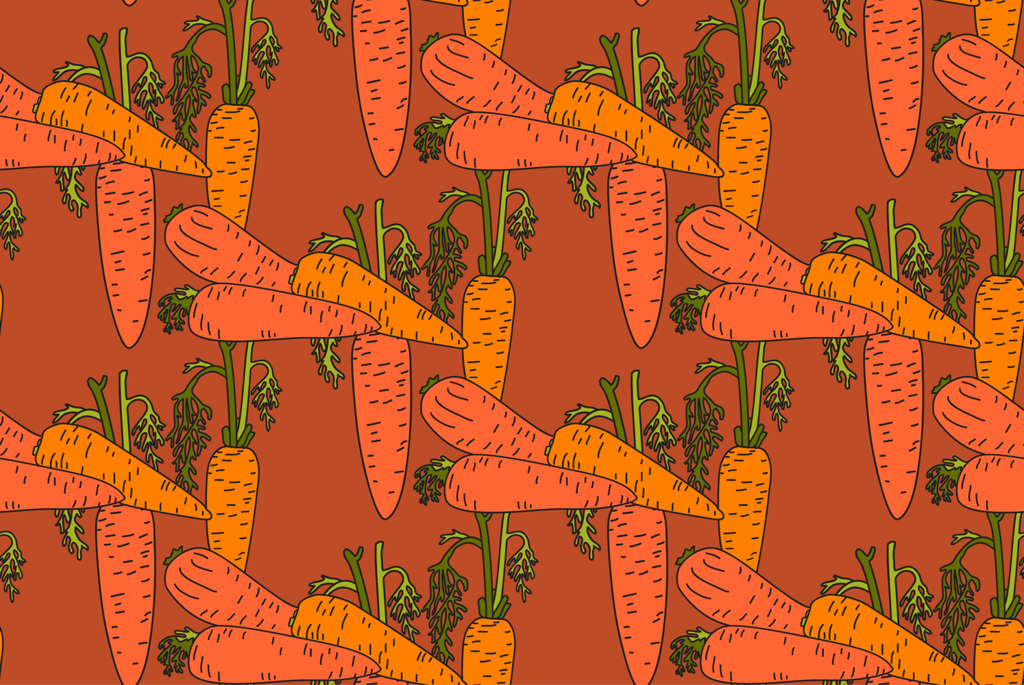 Botanical abstract seamless pattern with juicy carrots vector illustration. Colorful vegetables repeating cartoon pattern in orange color background. Graphic design for Fashion Cover Textile Birthday Greeting Card Invitation Wedding Poster Product Print Wallpaper Book Shop Market Advertising