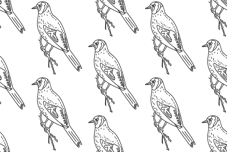 Line art seamless pattern with garden birds vector illustration. Hand drawn outline repeating carduelis birds pattern on white background. Graphic design for Cover Coloring Page Textile Fashion Print Birthday Greeting Card Invitation Wedding Poster Wallpaper Product Shop Advertising