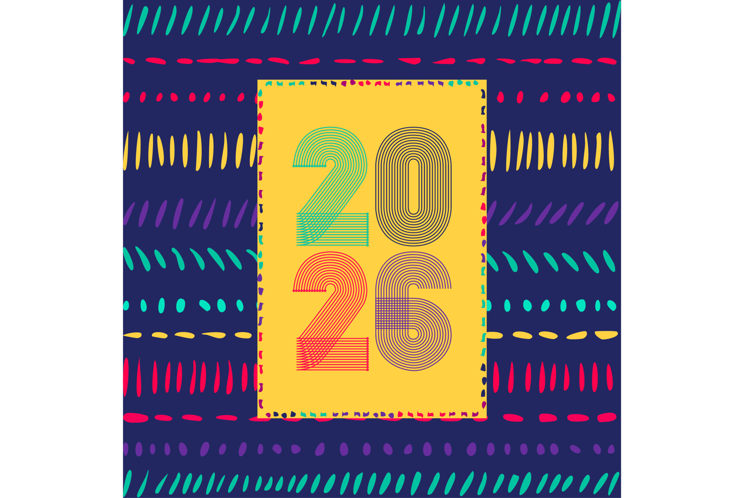 Retro cover with vertical colorful 2026 number on yellow blue geometric ethnic lines background. Graphic design vector illustration for Happy New Year Banner Greeting Card Invitation Poster Flyer Party Icon Symbol Sign Event Brochure Magazine Label Promotion Template Post Story Social media Company Name Folder Business Booklet Book Layout Ad Advertising Annual Report Christmas