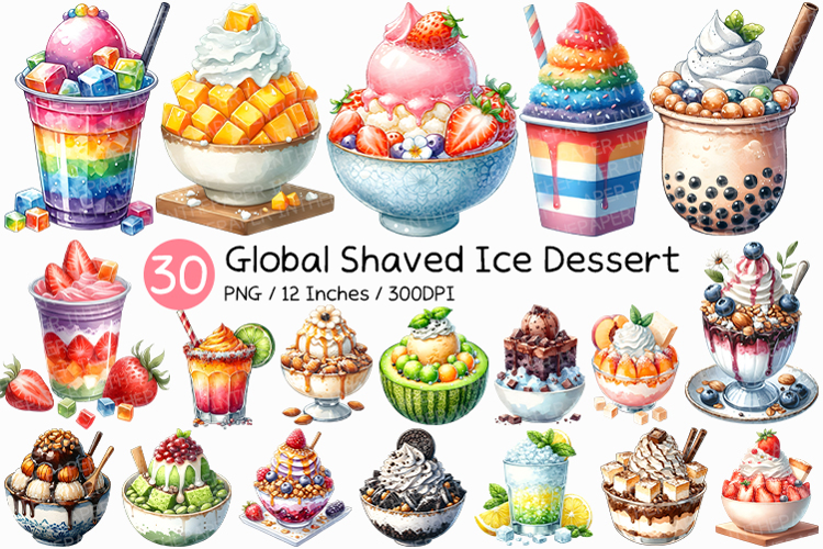 🗺️ This extensive collection features 30 charming watercolor images of international shaved ice desserts, perfect for adding a refreshing touch to your designs.