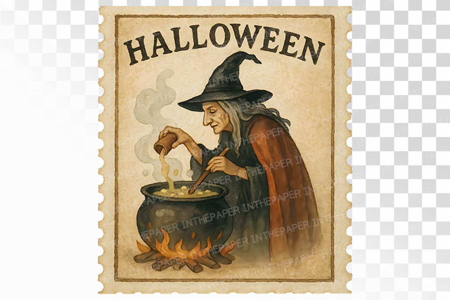 💖 This digital artwork features a vintage stamp with a detailed illustration of a witch stirring a bubbling potion in a cauldron over a fire. The classic style and warm tones evoke a sense of nostalgic Halloween magic and mystery.