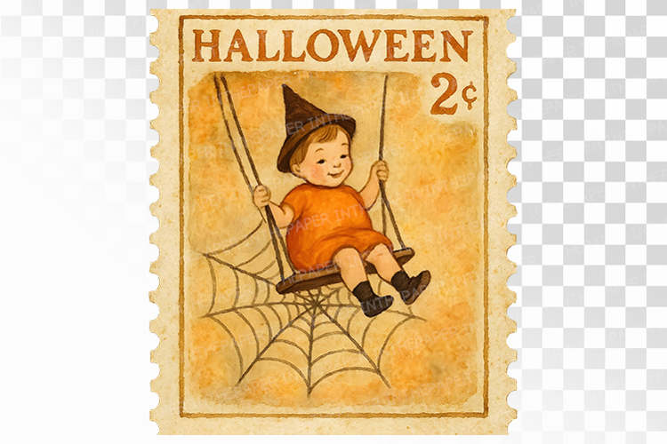 💖 This digital artwork features a charming vintage stamp with a cheerful child in a simple costume swinging on a giant spiderweb. The heartwarming illustration captures the innocent and whimsical spirit of Halloween childhood.
