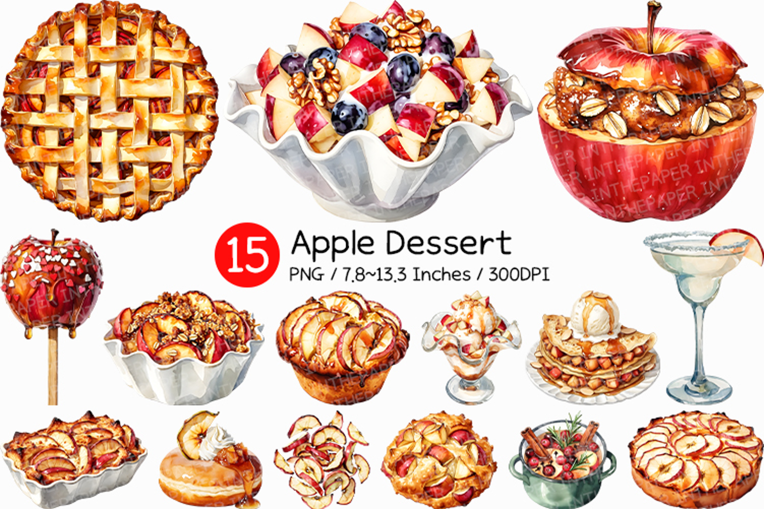 🥧 This set includes a variety of watercolor apple desserts such as pie, cake, muffin, donut, fritter, crisp, and baked apple treats.