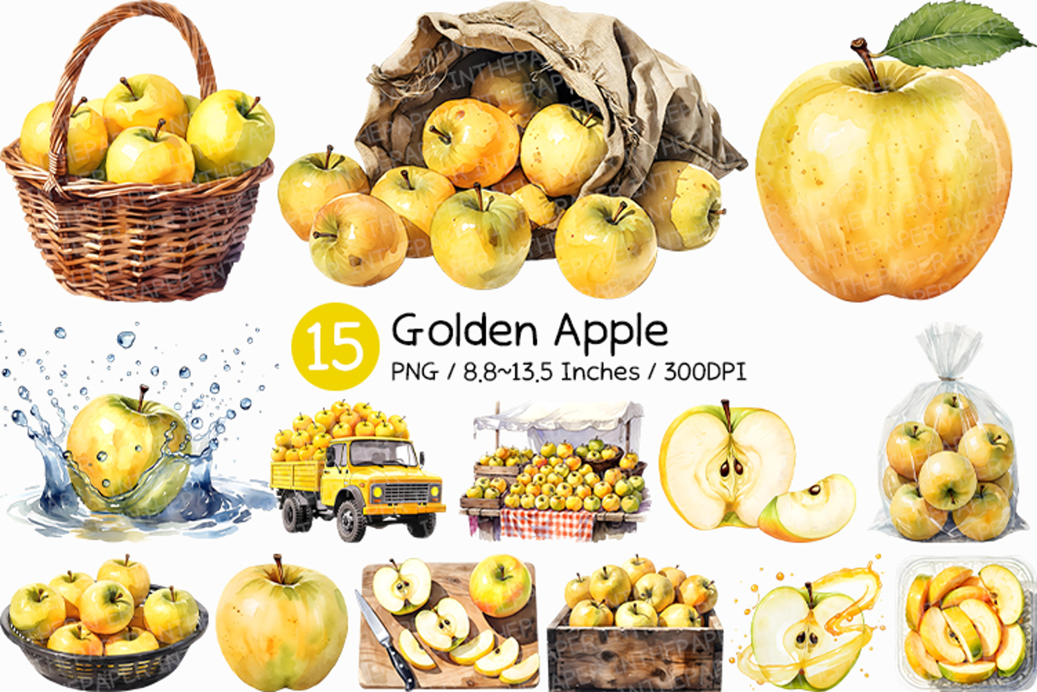 ✨ This set features yellow apples illustrated in multiple forms, including whole fruits, sliced halves, fresh cuts, and juicy splash styles.