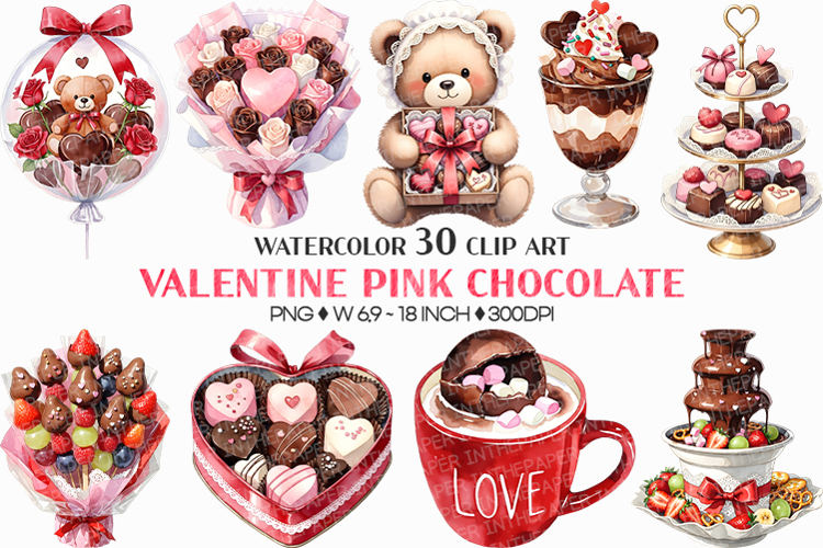 🍫 Create sweet and romantic Valentine designs with this pink chocolate watercolor clipart collection.