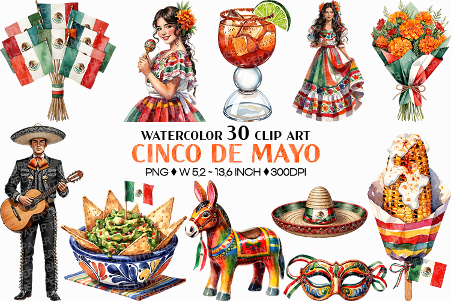 🎉 This bundle includes festive drinks, tacos, elote, guacamole, churros, mariachi instruments, sombrero, pinata, cactus plants, Mexican flags, floral bouquets, parade masks, traditional outfits, and decorative typography.