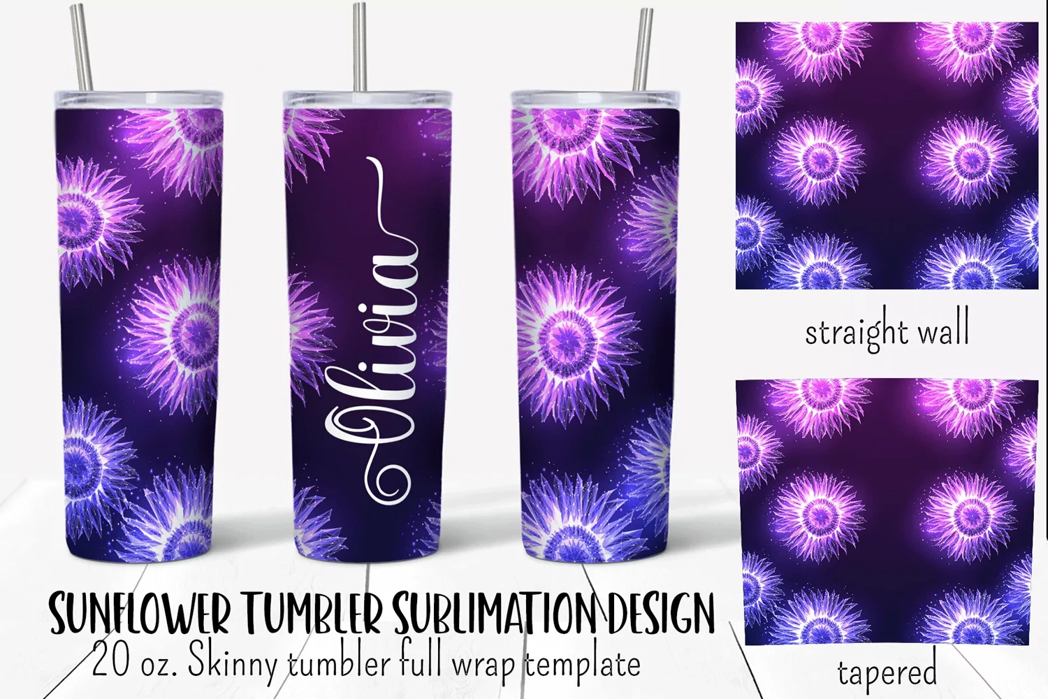 Sunflower personalized tumbler wrap sublimation design with glowing purple sunflowers on blue background and place to add text.  Straight and tapered walls 20 oz skinny tumbler full wrap png files for download.