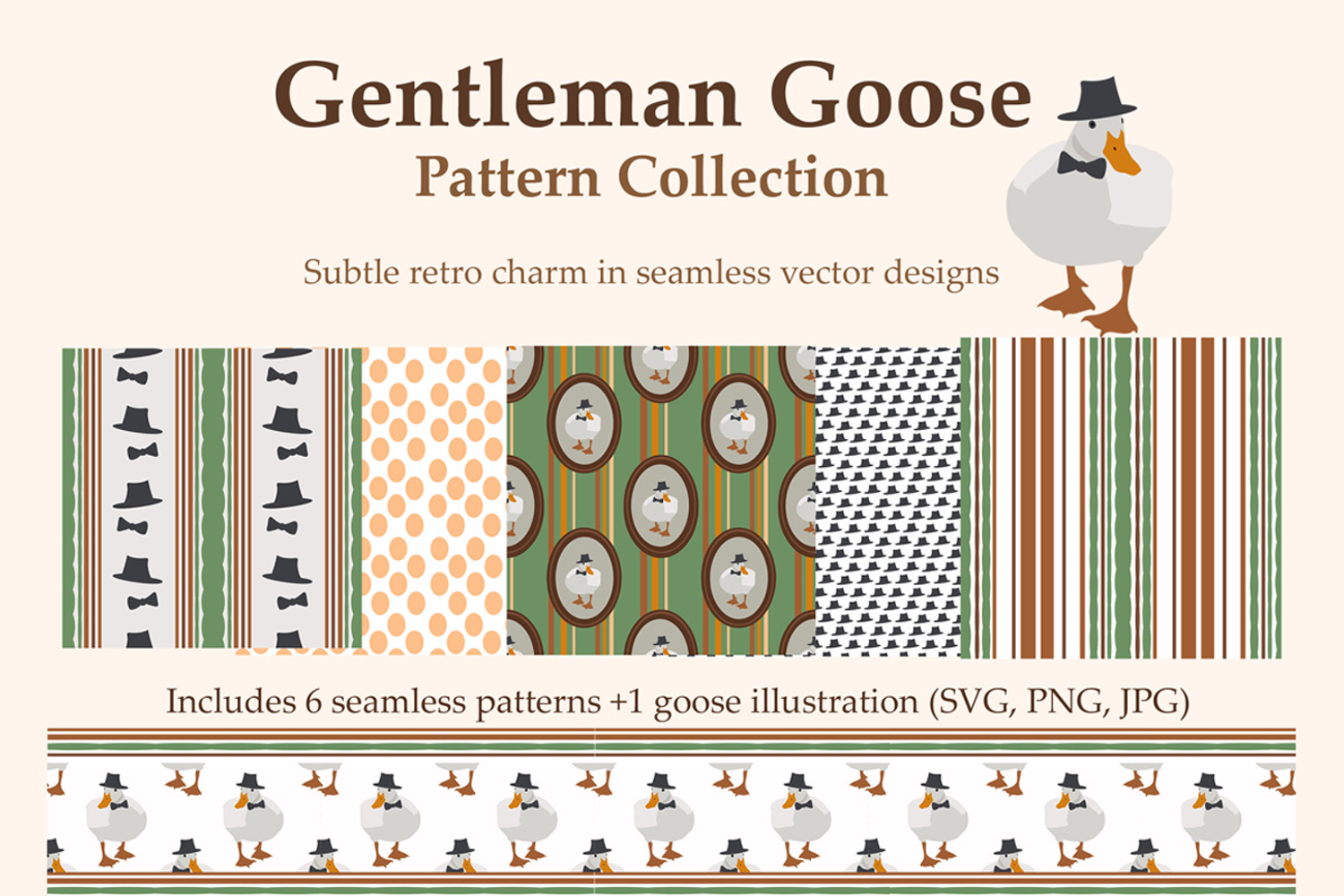 The Gentleman Goose Pattern Collection includes 6 seamless vector patterns and 1 cute goose illustration in SVG, PNG, eps and JPG formats.
