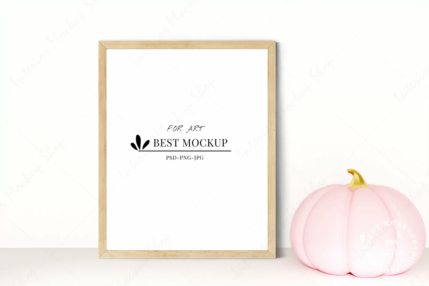 Wood frame mockup on the white wall with pink pumpkin