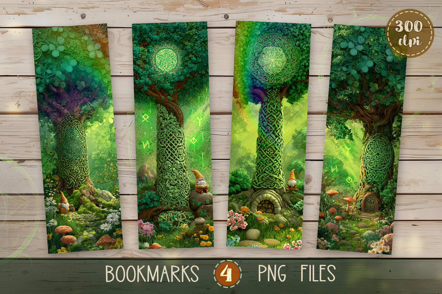 Step into a world of ancient Celtic magic where wise gnomes dwell within mystical trees, surrounded by the whispers of an enchanted forest and shimmering fairy light - 4 bookmark designs for print for St. Patrick's Day. 💚🍀