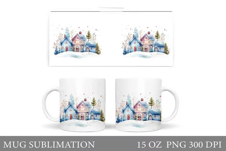 Winter Mug Wrap Sublimation. Winter Houses Mug Design