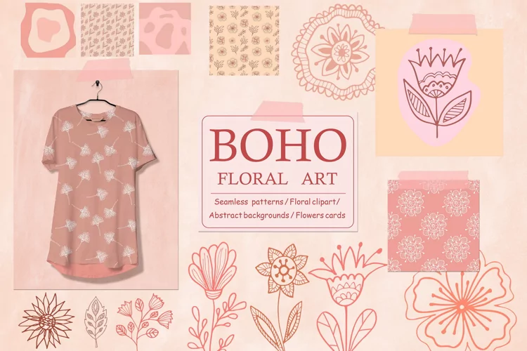 Instant download Boho floral clipart, seamless patterns, abstract backgrounds in folk style. Hand drawing clip art for craft projects, card making, printed paper items, scrapbooking, invitations, textile, children's clothing, web design, nursery decor.