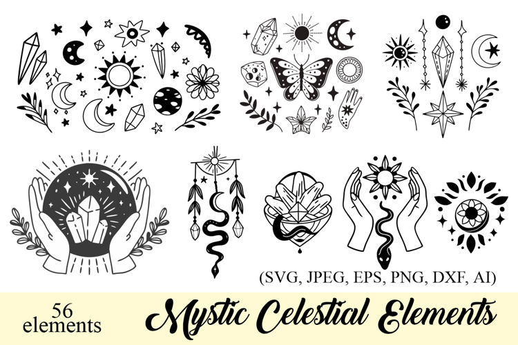 Elevate your design projects with this ultimate MEGA set of 56 hand-drawn mystical and celestial elements. This comprehensive collection is perfect for adding an enchanting touch of spiritual depth and bohemian magic to any creation.