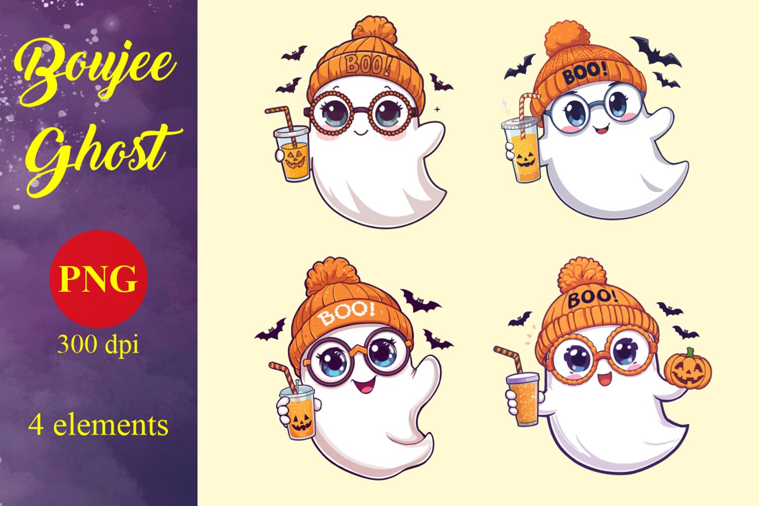 Step up your spooky season style with our Boujee Ghost PNG Clipart Bundle! This charming and trendy collection features 4 unique, high-resolution (300 DPI) ghost characters, perfect for adding a touch of "boujee" cuteness to all your Halloween and Fall projects.