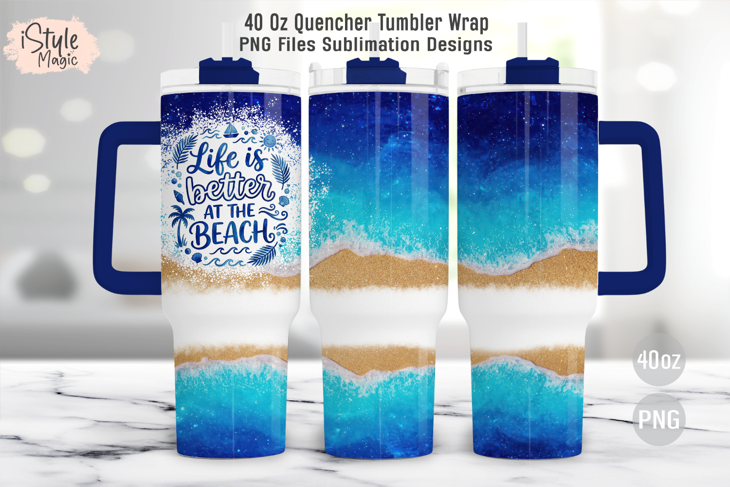 The layered blue waves, foamy surf, and sandy textures make every sip feel like a refreshing ocean escape