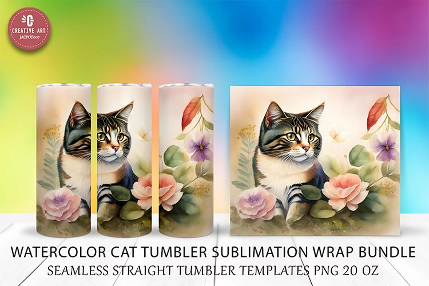 Cat Tumbler Sublimation Wrap Watercolor Seamless Straight Template PNG 20 oz