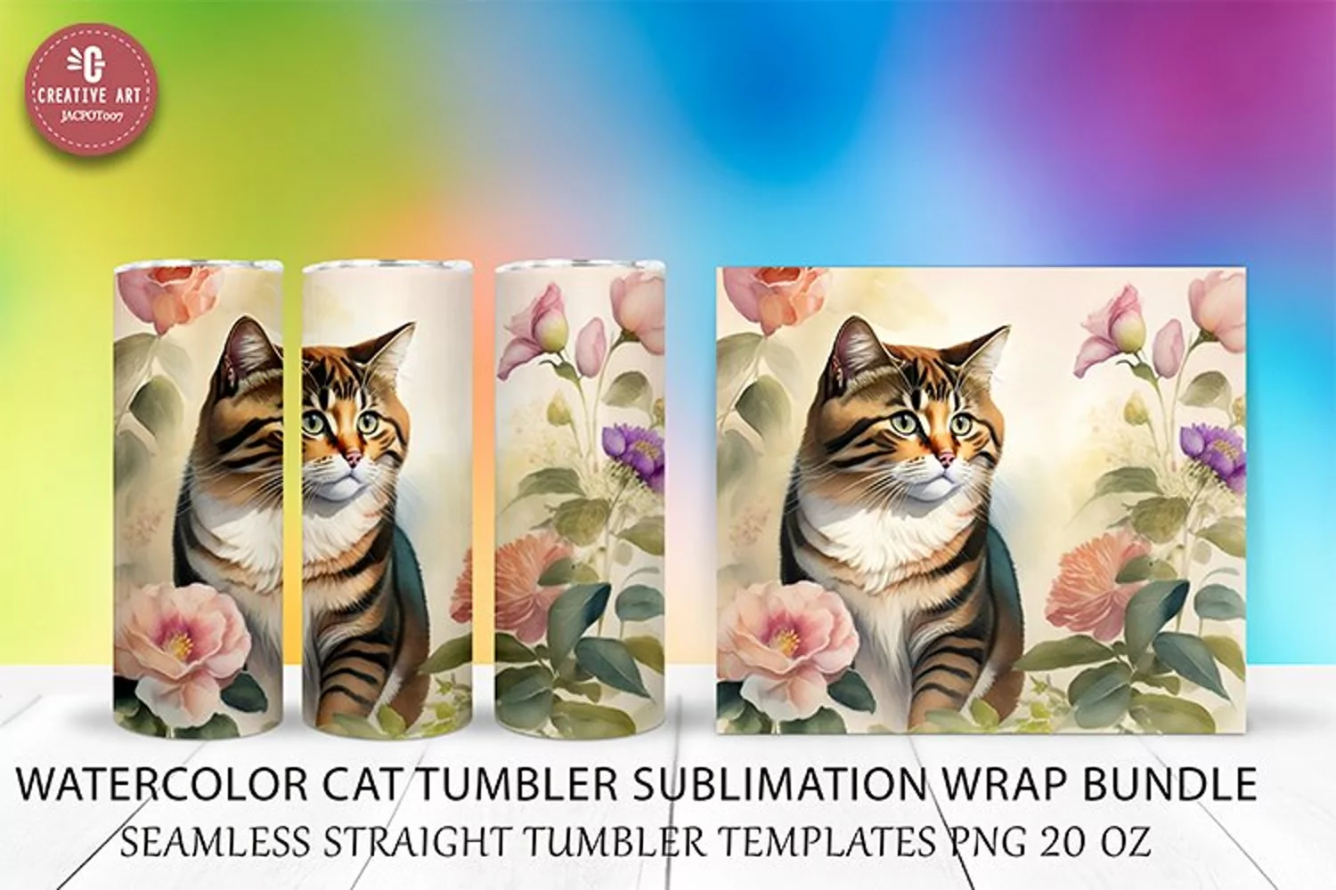 Cat Tumbler Sublimation Wrap Watercolor Seamless example image 1