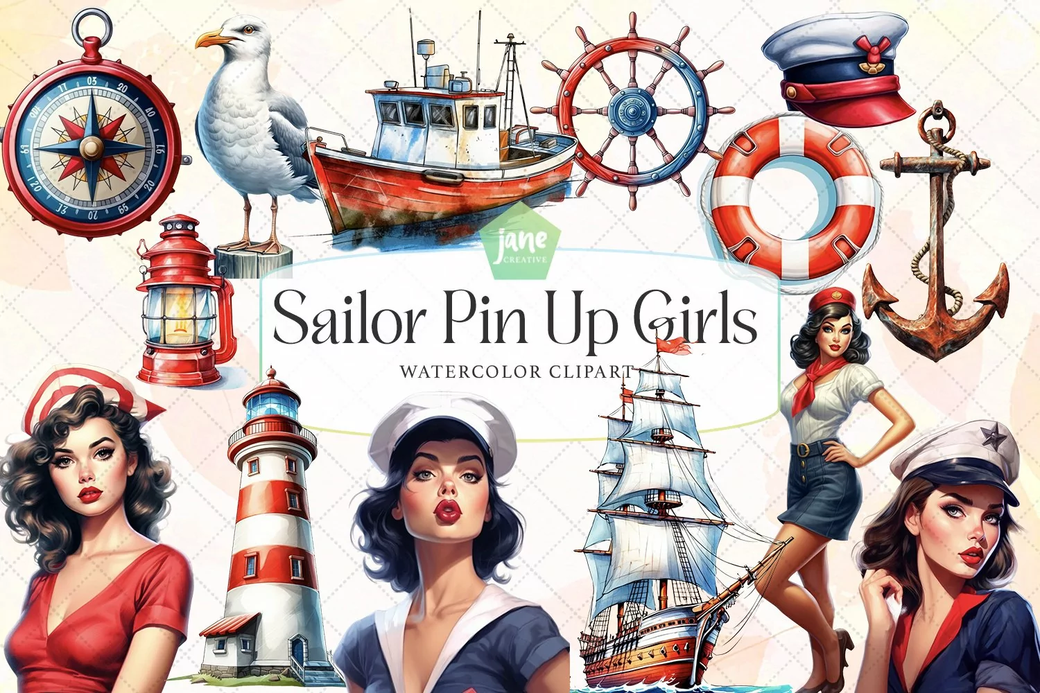 T-shirt Canvas Digital Illustrations Instant Download Paintings Watercolor Art Mugs Sublimation Design Sailor Pin Up Girls Watercolor