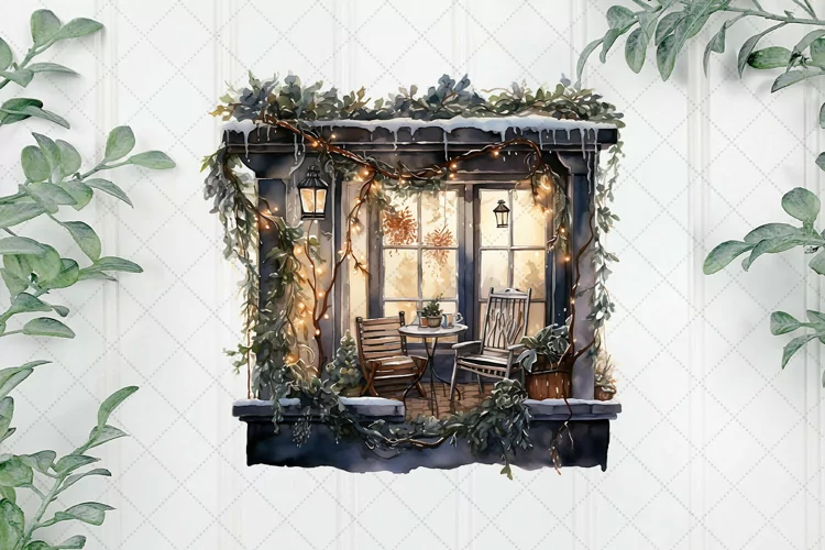 Art Illustrations Instant Download Digital Download Digital Design Digital Prints Cute Design Sublimation Design Winter Balcony At Night Winter Balcony