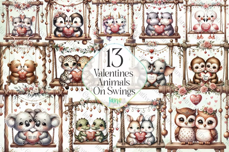 T-shirt Canvas Digital Illustrations Instant Download Paintings Watercolor Art Mugs Sublimation Design Valentines Animals On Swings Sublimation