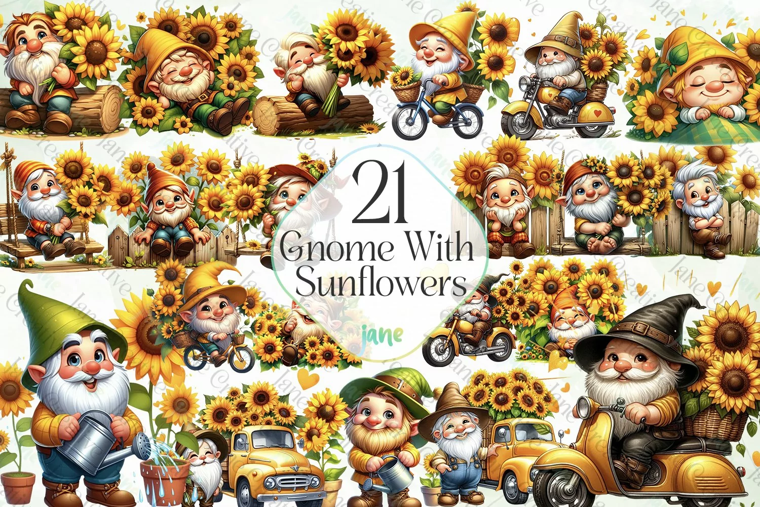 T-shirt Canvas Digital Illustrations Instant Download Paintings Watercolor Art Mugs Sublimation Design Gnome With Sunflowers Sublimation