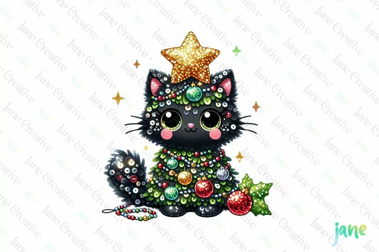 Sparkling Christmas Black Cat Character Clipart example image 1