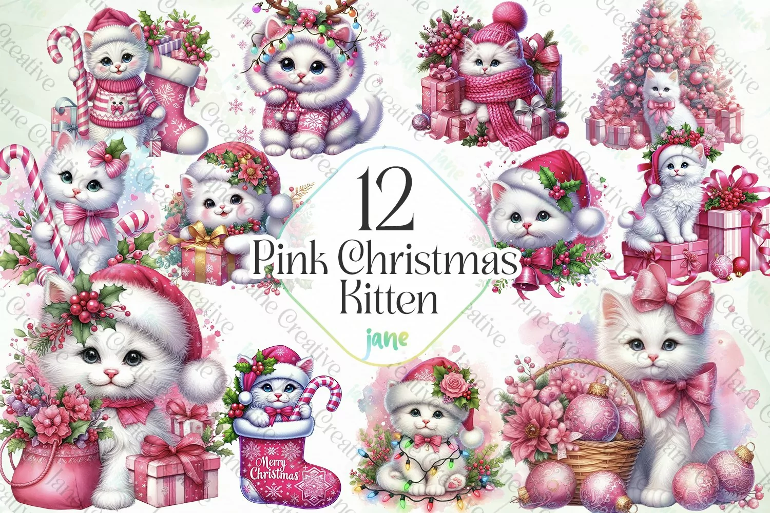 Watercolor Digital Instant Download Digital Design Sublimation Digital Prints Cute Design Sublimation Design Illustrations Art Pink Christmas Kitten Sublimation