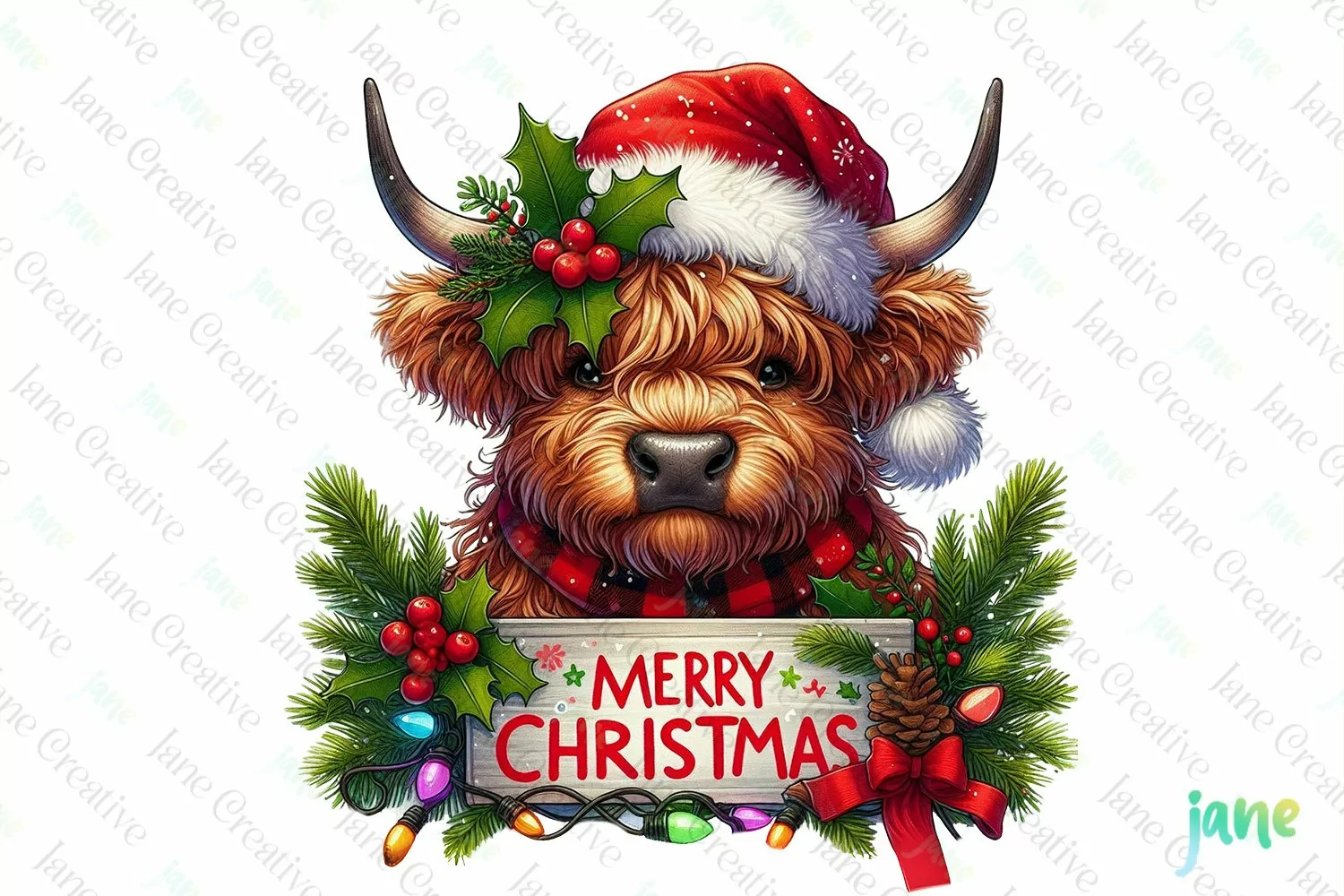 Cow Highland Animals Holding Merry Christmas Sign example image 1