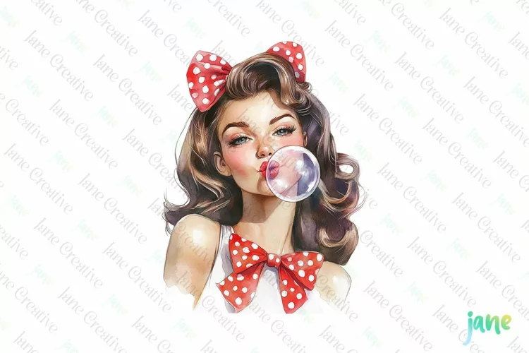 Art Illustrations Digital Download Digital Design Digital Prints Cute Design Sublimation Design Pin Up Girl Retro Girl Blowing A Bubblegum Retro Girl With Bubblegum