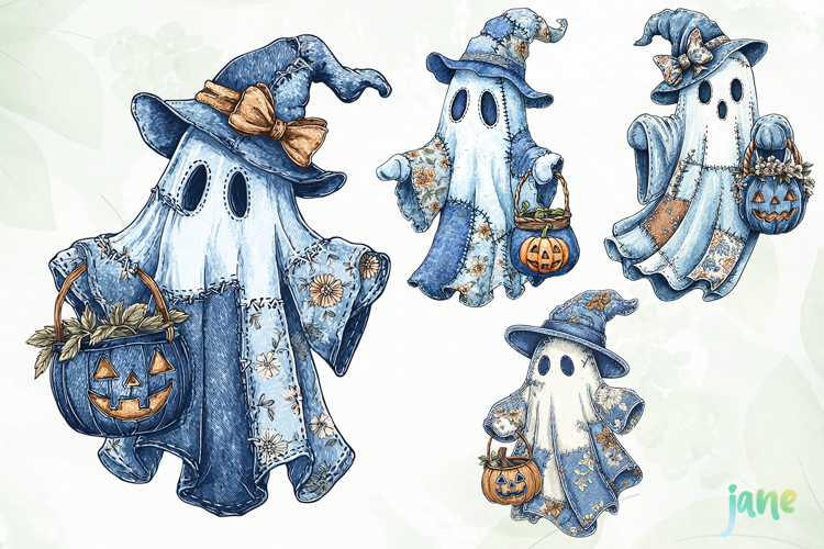 Retro Halloween Blue Denim Ghost Sublimation Clipart example image 1