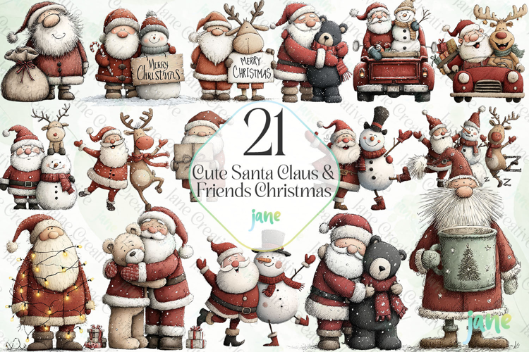 Watercolor Digital Instant Download Digital Design Sublimation Digital Prints Cute Design Sublimation Design Illustrations Art Cute Santa Claus & Friends Christmas