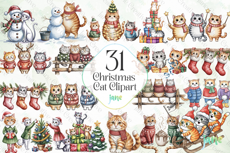 Watercolor Digital Instant Download Digital Design Sublimation Digital Prints Cute Design Sublimation Design Illustrations Art Christmas Cat Clipart Sublimation Bundle