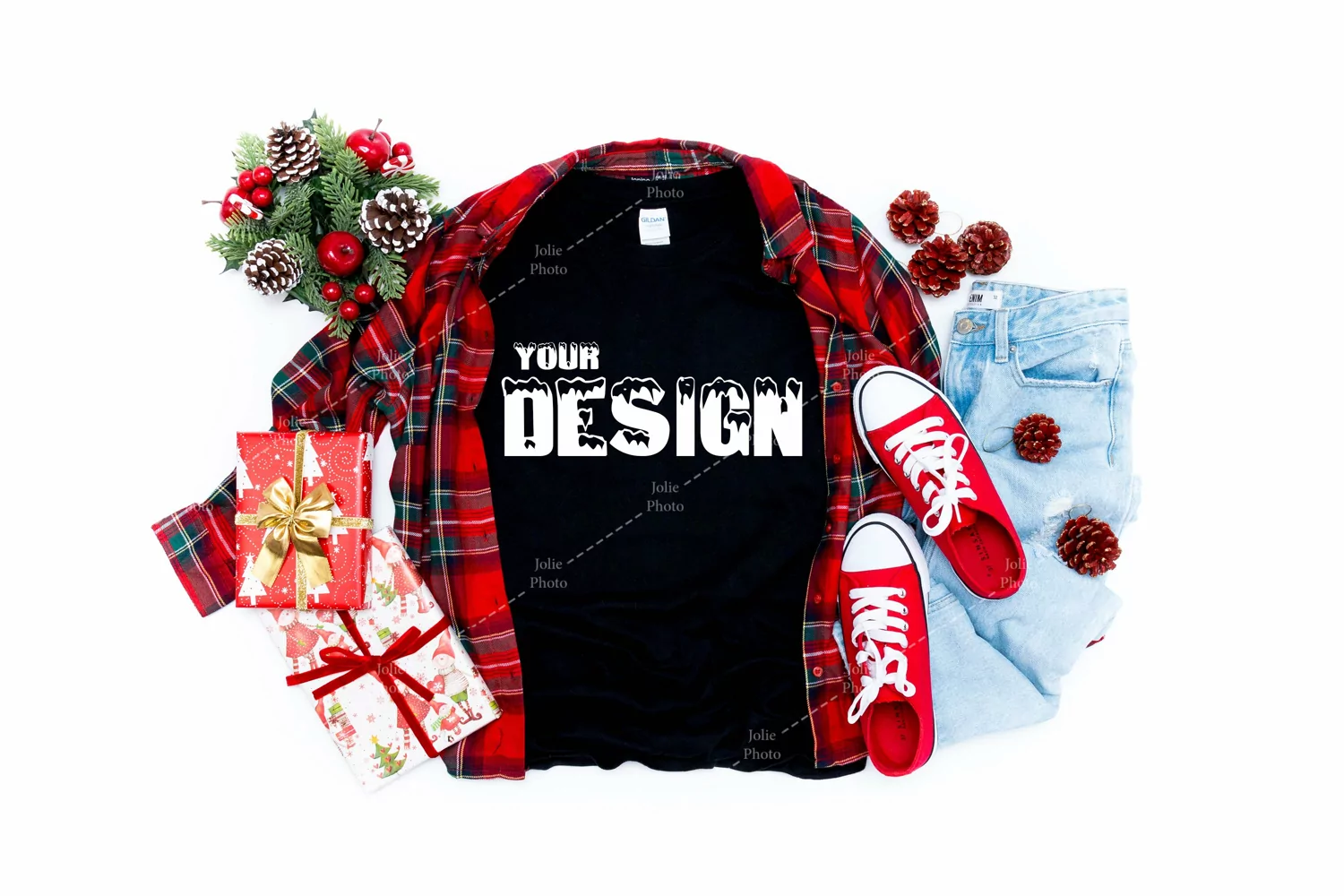 A simple Gildan 64000 Softstyle t-shirt photo mockup featuring red snickers, jeans, checkered shirt and Christmas decorations. This high-quality t-shirt stock photography featuring a Gildan 64000 Unisex Tee in black color can be used to display your Christmas designs, art or photography products for your online store, website or social media with just a few clicks. A huge time saver: simply add your design to the photo by using photo editing software.