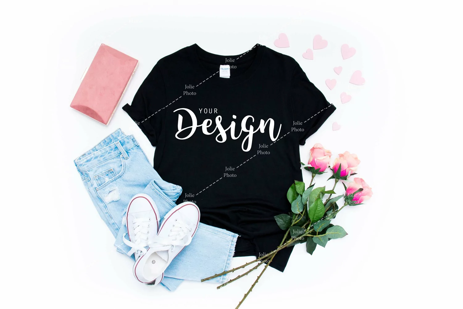 A simple Gildan 64000 Softstyle t-shirt mockup for Valentine's Day featuring jeans, snickers, pink roses and pink hearts. This high-quality t-shirt stock photography featuring a Gildan 64000 Softstyle Unisex Tee in black color can be used to display your designs, art or photography products for your online store, website or social media with just a few clicks. A huge time saver: simply add your design to the photo by using photo editing software.