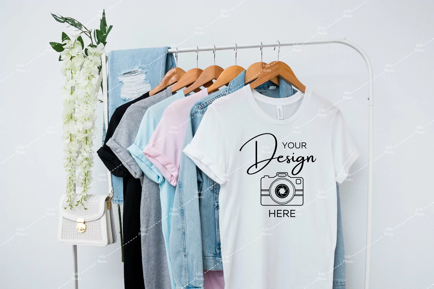 A simple Bella Canvas 3001 t-shirt photo mockup. This high-quality t-shirt stock photography featuring a Bella Canvas Unisex Tee in white color can be used to display your designs, art or photography products for your online store, website or social media with just a few clicks. A huge time saver: simply add your design to the photo by using photo editing software.