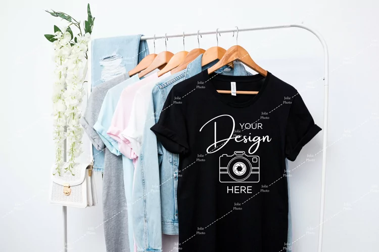 A simple Bella Canvas 3001 t-shirt photo mockup. This high-quality t-shirt stock photography featuring a Bella Canvas Unisex Tee in black color can be used to display your designs, art or photography products for your online store, website or social media with just a few clicks. A huge time saver: simply add your design to the photo by using photo editing software.