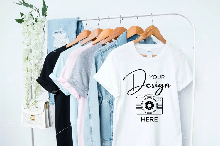 A simple Gildan 64000 Softstyle t-shirt photo mockup. This high-quality t-shirt stock photography featuring a Gildan 64000 Unisex Tee in white color can be used to display your designs, art or photography products for your online store, website or social media with just a few clicks. A huge time saver: simply add your design to the photo by using photo editing software.