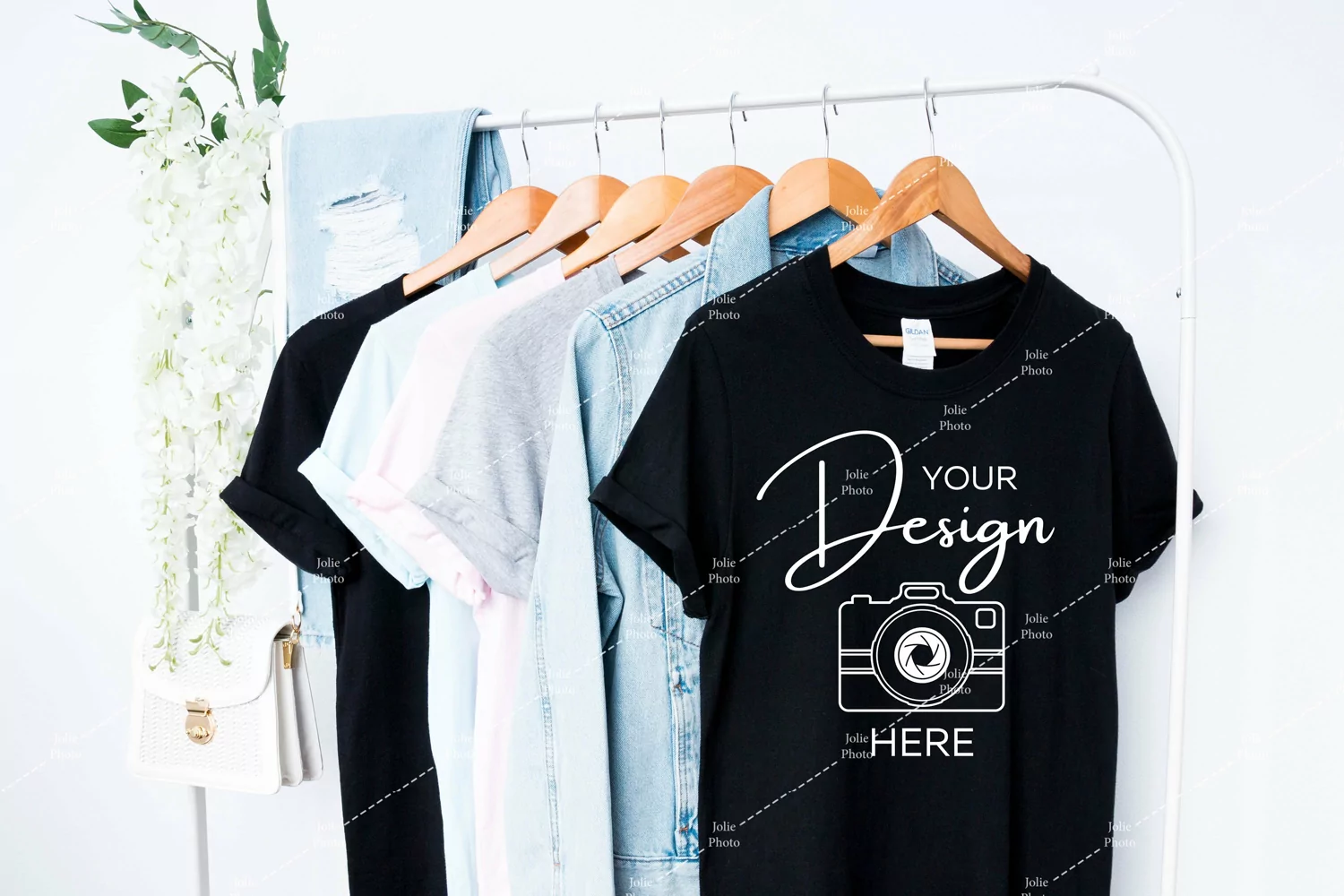 A simple Gildan 64000 Softstyle t-shirt photo mockup. This high-quality t-shirt stock photography featuring a Gildan 64000 Unisex Tee in black color can be used to display your designs, art or photography products for your online store, website or social media with just a few clicks. A huge time saver: simply add your design to the photo by using photo editing software.