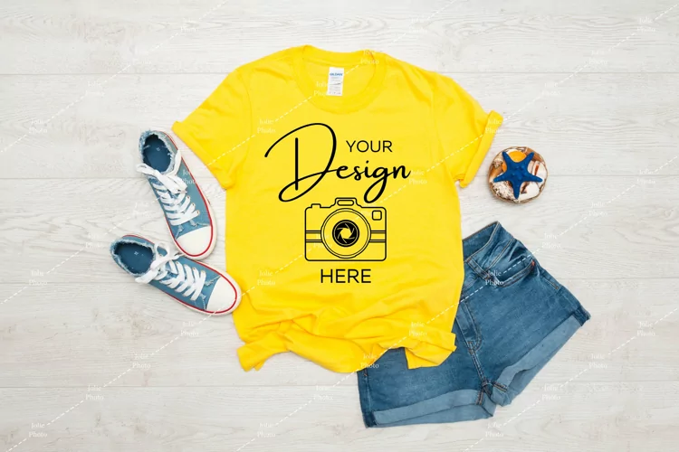 A simple Gildan 64000 Softstyle t-shirt photo mockup for Summer featuring jeans, snickers and seashells. This high-quality t-shirt stock photography featuring a Gildan 64000 Unisex Tee in daisy yellow color can be used to display your designs, art or photography products for your online store, website or social media with just a few clicks. A huge time saver: simply add your design to the photo by using photo editing software.