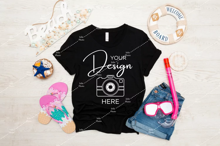 A simple Bella Canvas 3001 t-shirt photo mockup featuring jeans, slippers and summer props. This high-quality t-shirt stock photography featuring a Bella Canvas Unisex Tee in black color can be used to display your designs, art or photography products for your online store, website or social media with just a few clicks. A huge time saver: simply add your design to the photo by using photo editing software.