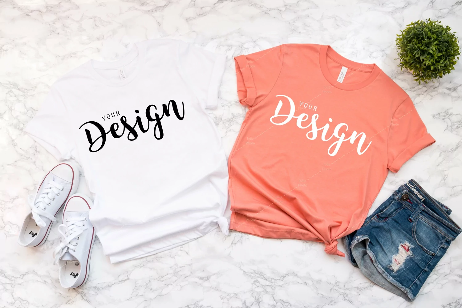 A simple Bella Canvas 3001 2 t-shirts photo mockup featuring sneakers, jeans and a small plant. This high-quality tshirt stock photography featuring a Bella Canvas Unisex Tee in white color and one in sunset color can be used to display your designs, art or photography products for your online store, website or social media with just a few clicks. A huge time saver: simply add your design to the photo by using photo editing software.