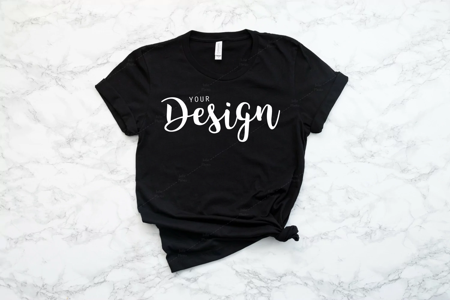 A simple Bella Canvas 3001 t-shirt photo mockup. This high-quality tshirt stock photography featuring a Bella Canvas Unisex Tee in black color can be used to display your designs, art or photography products for your online store, website or social media with just a few clicks. A huge time saver: simply add your design to the photo by using photo editing software.