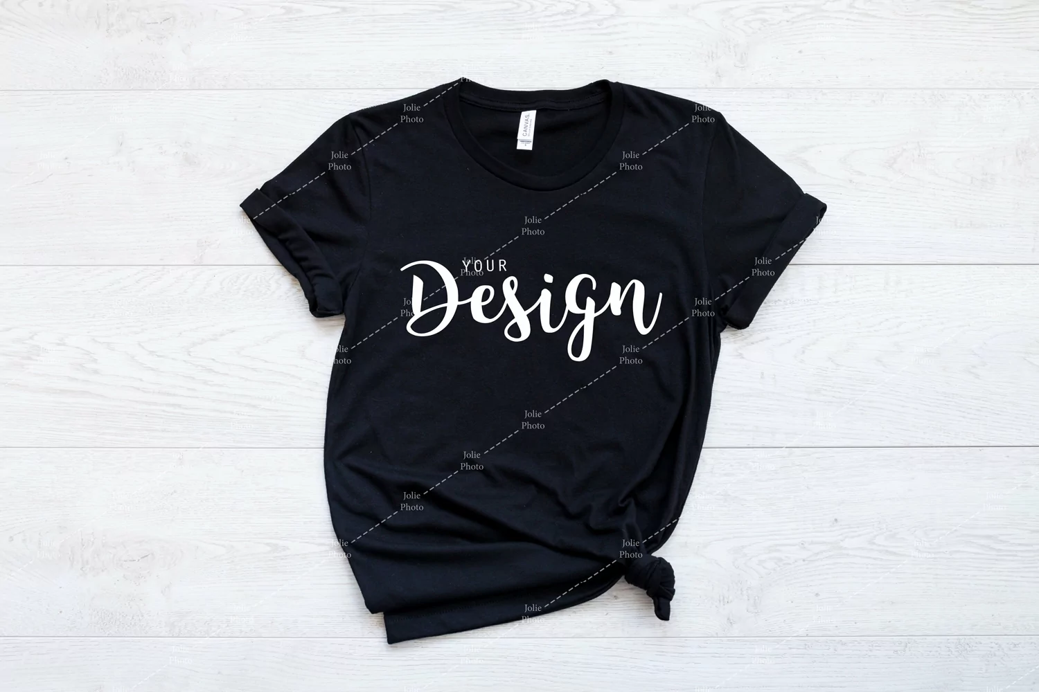 A simple Bella Canvas 3001 t-shirt photo mockup. This high-quality t-shirt stock photography featuring a Bella Canvas Unisex Tee in black color can be used to display your designs, art or photography products for your online store, website or social media with just a few clicks. A huge time saver: simply add your design to the photo by using photo editing software.