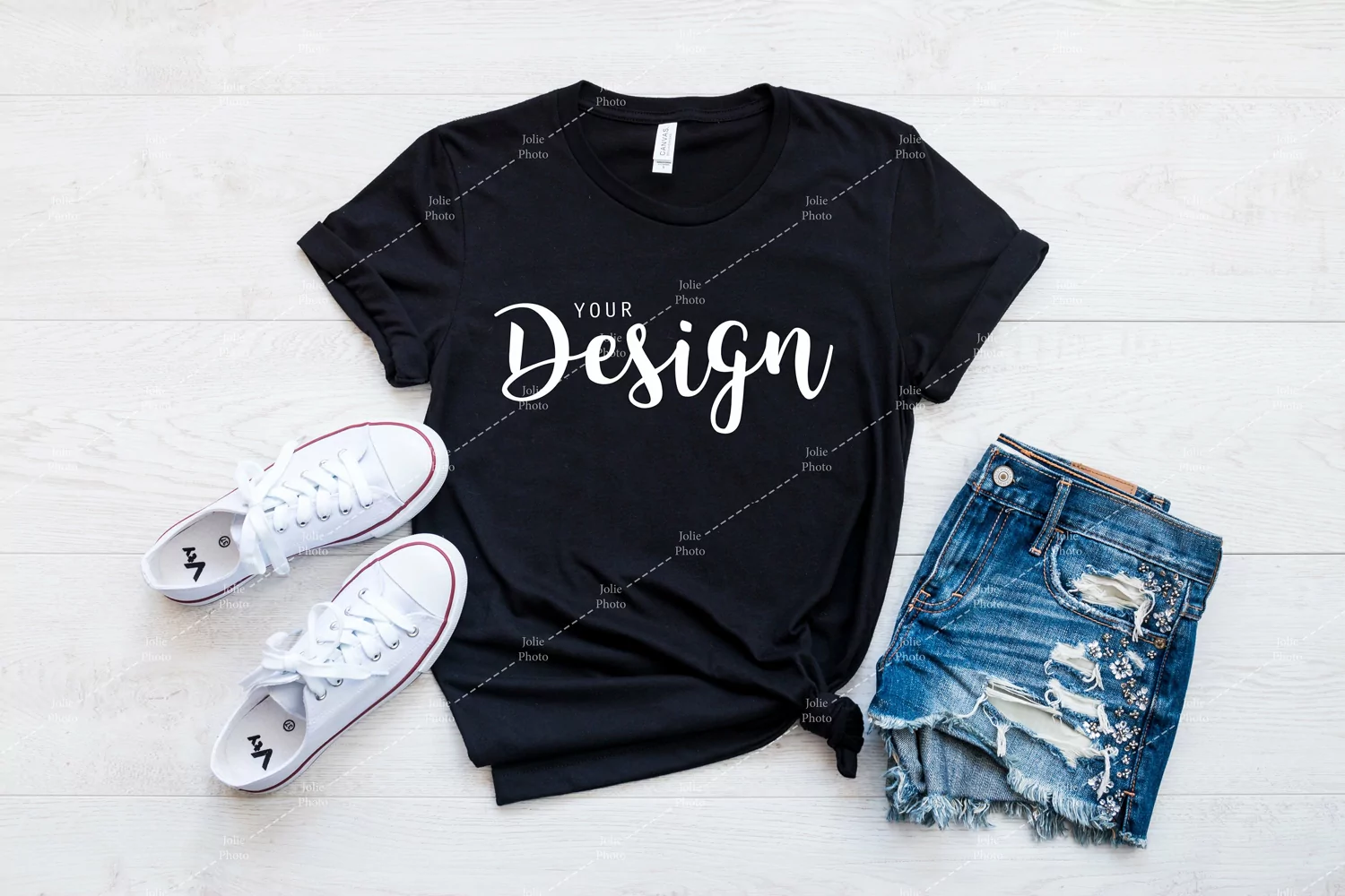 A simple Bella Canvas 3001 t-shirt photo mockup featuring sneakers and jeans. This high-quality t-shirt stock photography featuring a Bella Canvas Unisex Tee in black color can be used to display your designs, art or photography products for your online store, website or social media with just a few clicks. A huge time saver: simply add your design to the photo by using photo editing software.
