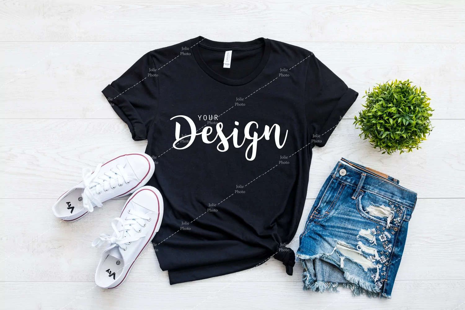 A simple Bella Canvas 3001 t-shirt photo mockup featuring sneakers, jeans and a small plant. This high-quality t-shirt stock photography featuring a Bella Canvas Unisex Tee in black color can be used to display your designs, art or photography products for your online store, website or social media with just a few clicks. A huge time saver: simply add your design to the photo by using photo editing software.
